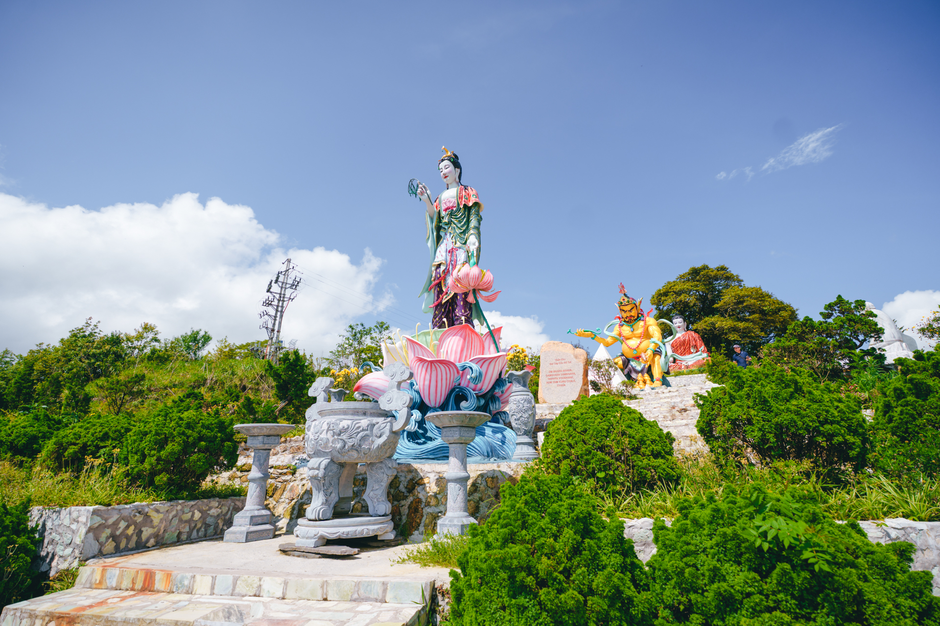 Phía trước là Bồ Tát Quán Thế Âm, hiện thân của đại từ đại bi. Ánh mắt hiền từ như lắng nghe muôn nỗi khổ đau của chúng sinh, gợi lại hình bóng Mẹ hiền giữa đời. Ai hữu duyên ngước nhìn, lòng chợt lặng, tâm chợt nhẹ – như được ôm trọn trong vòng tay của mẹ Từ Bi.