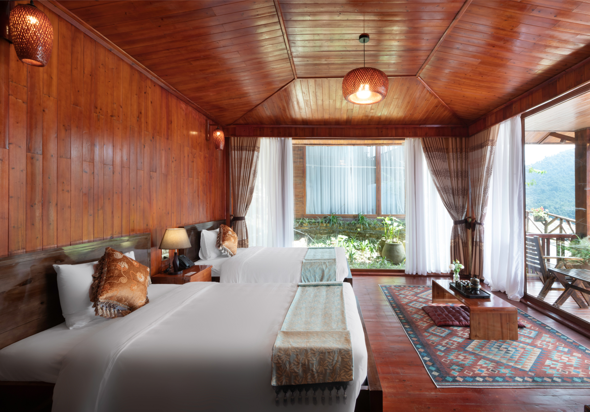 Bungalow hướng trọn núi rừng Hoàng Liên Sơn, nơi bạn đắm chìm trong vẻ đẹp hoang sơ và kỳ vĩ. Thiết kế trang nhã, tiện nghi đầy đủ, lý tưởng để tận hưởng sự riêng tư và thanh bình giữa thiên nhiên.